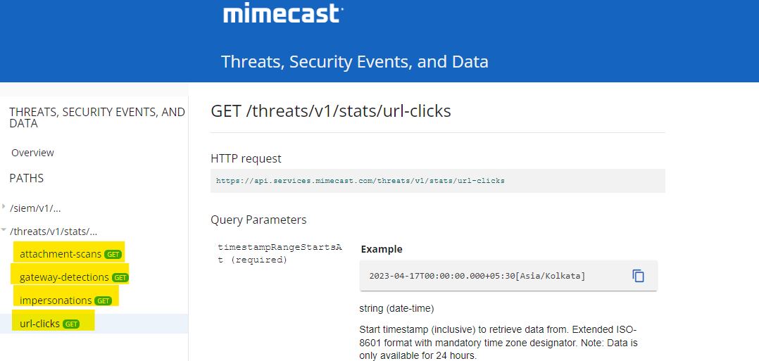The initial pop-up also asks for the timeStampRangeStartsAt parameter. This is a parameter for the stats endpoint, Attachment-Scans, Gateway-Detections, Impersonations & URL-Clicks. This is in the ISO 8601 Extended format.