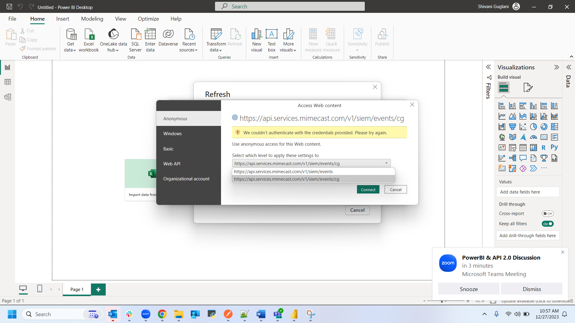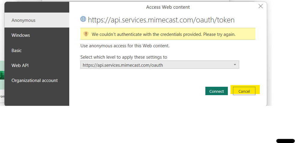 Any popup asking to set-up “Access Web Connect” can also be ignored. Also, in order to connect with the Mimecast API2.0, we have to use the Anonymous Web Access Method.