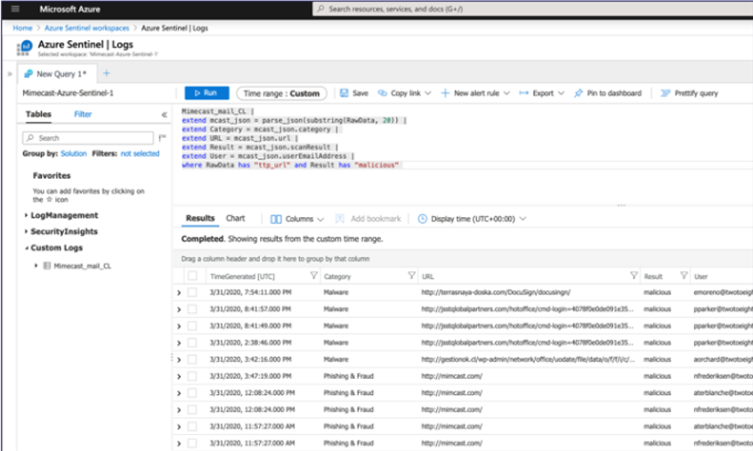 2. Email intelligence provided by Mimecast is sent to Microsoft Sentinel for normalization.
