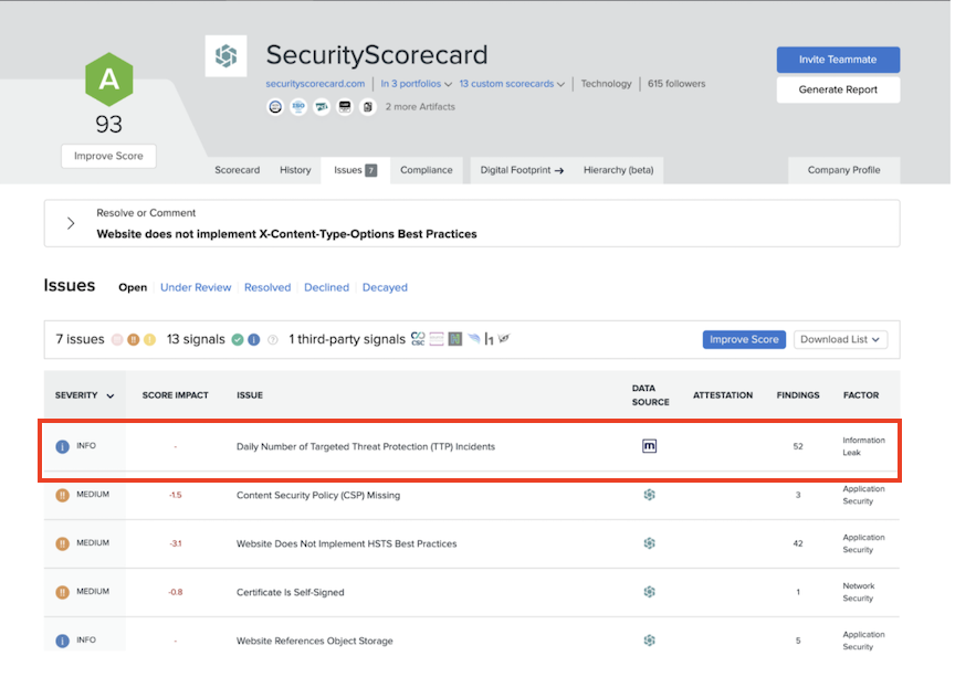 Integrate Mimecast with SecurityScorecard to leverage the TTP service to detect email-related incidents in your domain and provide quantitative data of these incidents in a private, informational signal. Each finding for this signal represents the total number of times TTP is triggered on a given day. An increased count of signals over your organization’s baseline may indicate exposure to heightened phishing or malware activity.
