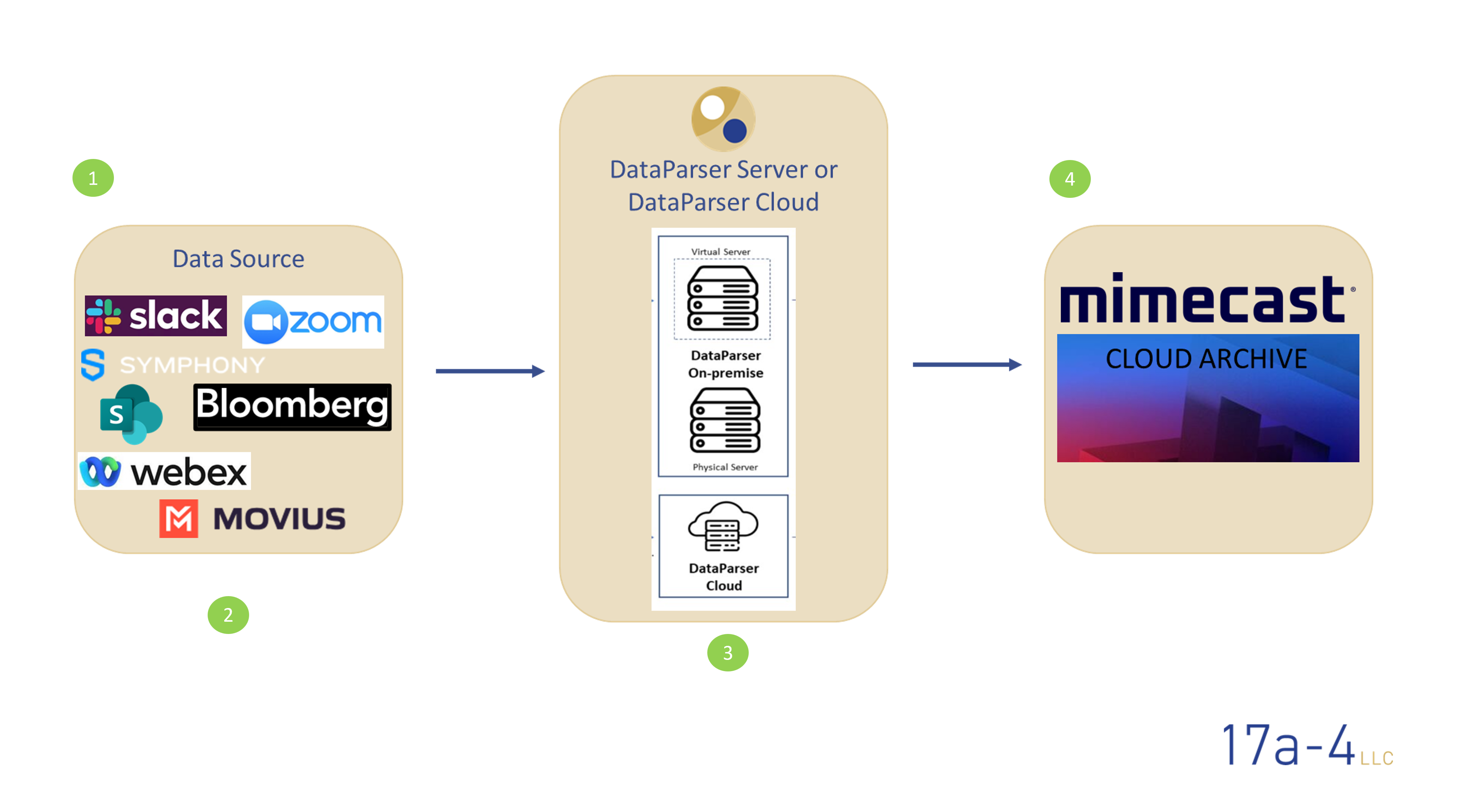 Create a unified archive with DataParser collecting your third-party data and securely delivering to Mimecast. DataParser lets you manage all your communications and data in one location for streamlined compliance policies and procedures. Slack, Zoom, Webex, Symphony, Viva Engage, Movius, Bloomberg, ServiceNow and more are all supported.