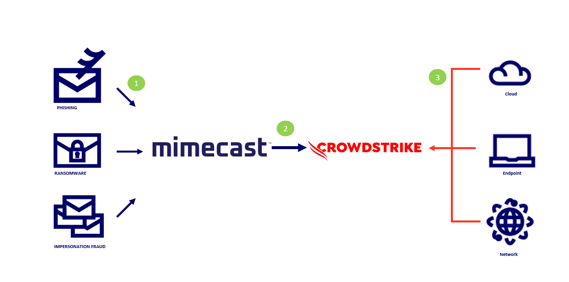 2. Email intelligence provided by Mimecast is sent to CrowdStrike Logscale for normalization and correlation.