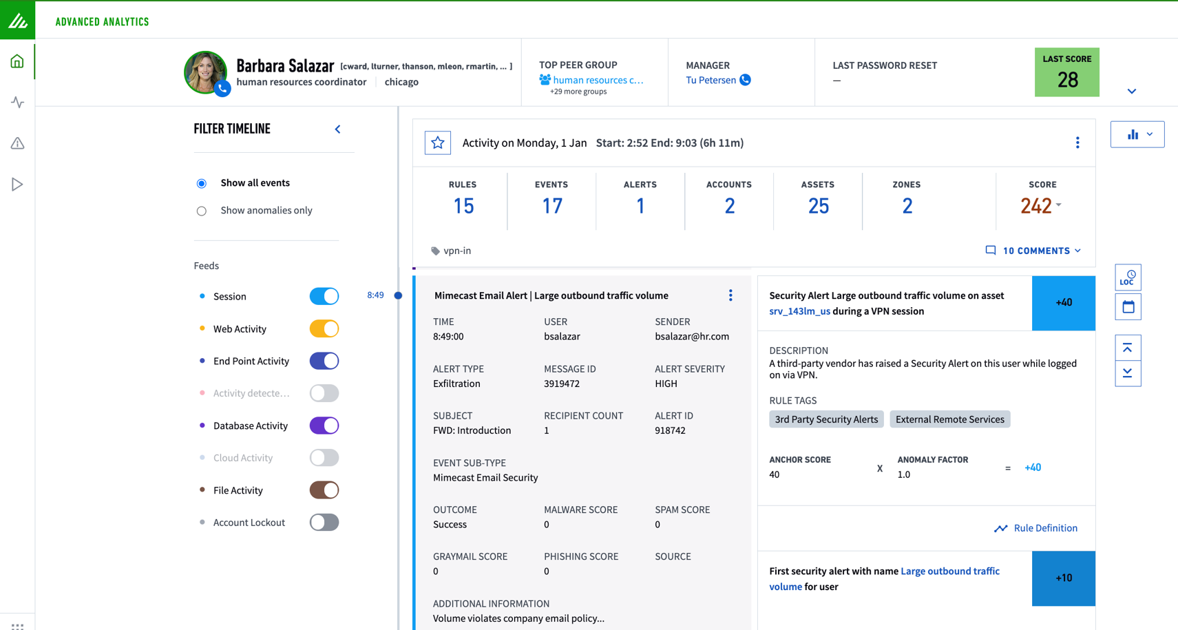 Correlation across Mimecast events, cloud, endpoint, and network data to quickly identify high-risk individuals and devices that may create future security breaches.