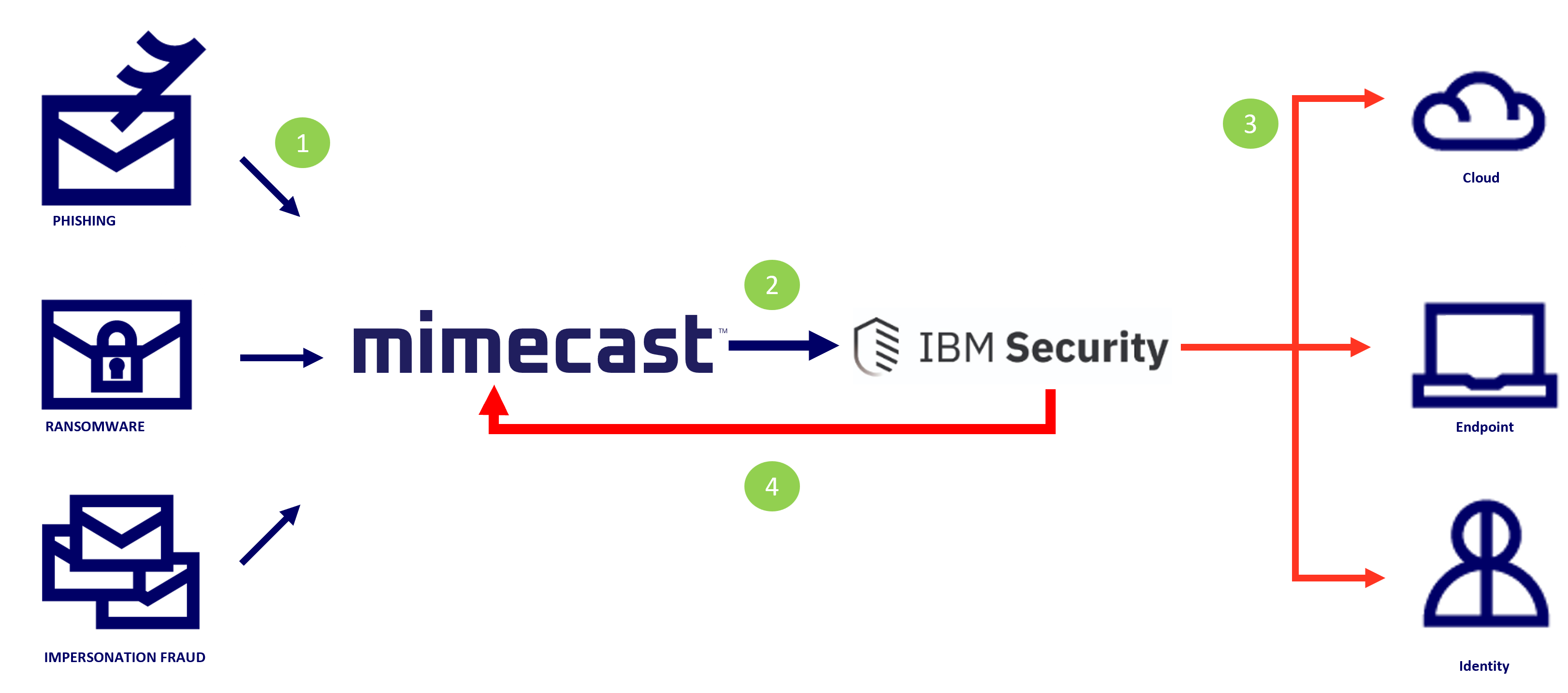 By integrating Mimecast and IBM Security QRadar SOAR, organizations gain search and correlation capabilities to detect and respond to cyberattacks from a central location, without having to pivot between consoles. QRadar SOAR is designed to help the security team augment the analyst experience, allowing SOC teams to respond to cyberthreats confidently, automate intelligently and collaborate consistently. It guides the team in resolving incidents by codifying established incident response processes into dynamic playbooks.