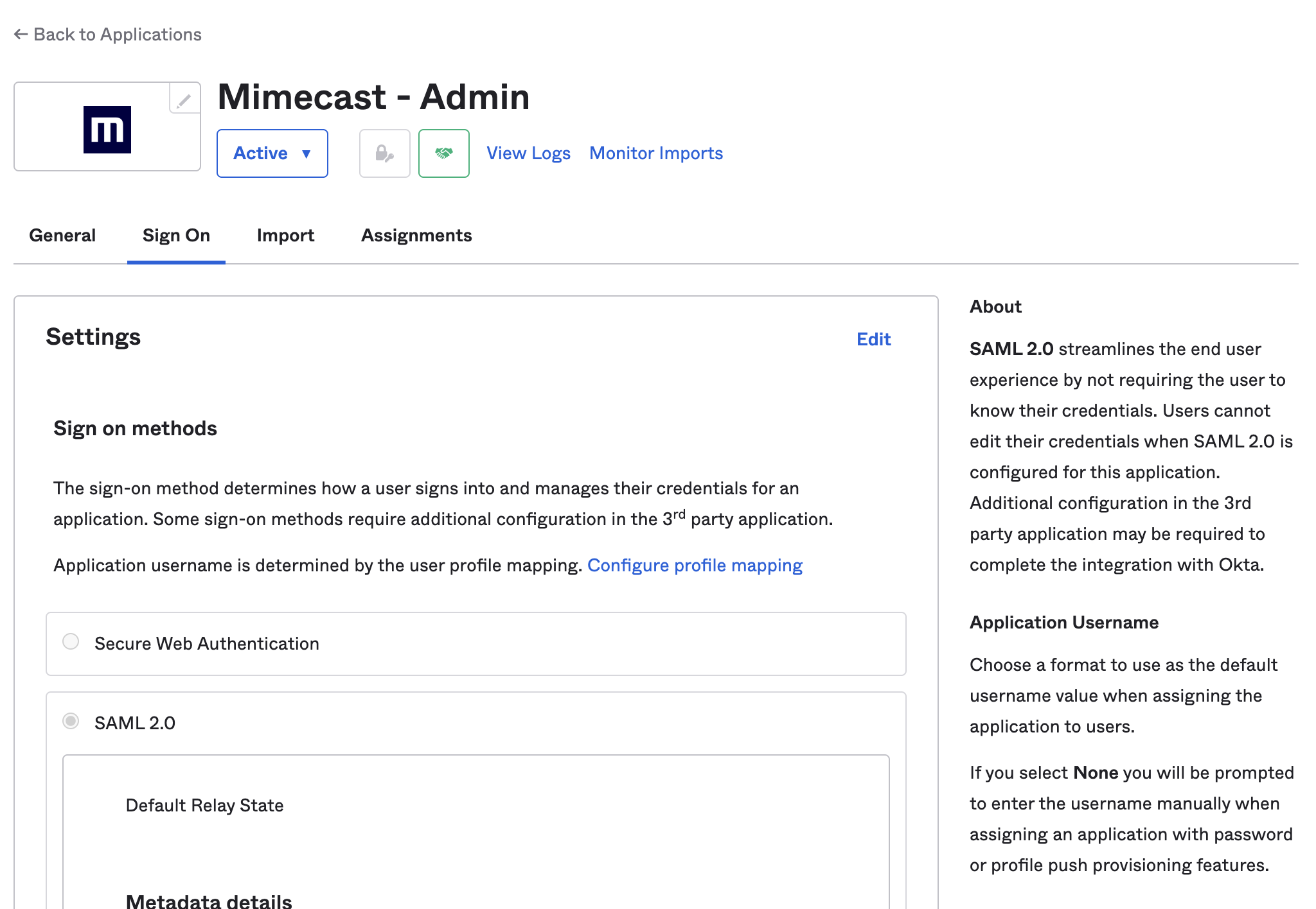 Okta integrates with Mimecast to offer a comprehensive solution to help secure access to cloud and on-premises applications through centralized access policies with Single Sign-On (SSO) and Multi-Factor Authentication (MFA). Okta and Mimecast allow organizations to collaborate securely and efficiently with the comfort that the right users have permissions to the Mimecast Administration Console and the Personal Portal.