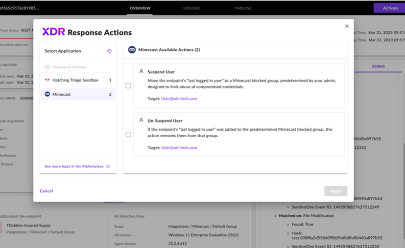 3. Response actions within the singularity platform suspend suspicious Mimecast users.