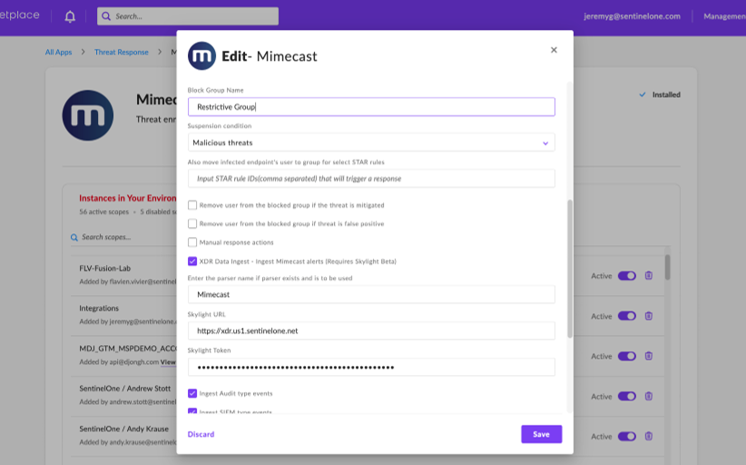 Mimecast and SentinelOne provide an integrated solution to stop threats, provide security insights and streamline response across the organization. By integrating Mimecast with SentinelOne, SecOps teams can standardize their incident response processes, accelerate the time it takes to detect and apply security measures for containing and remediating attack campaigns. The integration helps with cross-domain detections, by leveraging identity endpoint, application, email, and other tools to obtain a complete understanding of the threat. Through the sharing of intelligence from email and endpoint security solutions, analysts obtain increased visibility and context into threats that would not be addressed in a typical siloed security approach.