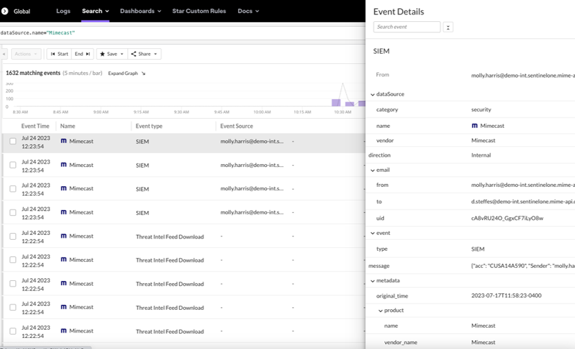 Ingest logs from Mimecast into Singularity for centralized email threat visibility, threat hunting capabilities, dashboarding, and cross-telemetry alerting. Analysts can obtain better visibility into potential threats and take appropriate action to mitigate risks.
